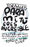 Para mi tu eres increible es un libro escrito e ilustrado por el artista Torna Gris. Este libro funciona como un acompañamiento para jovenes, adultos y toda la familia en general ya que sus páginas buscan decir te quiero de una forma nueva, creativa y amable. Es un libro para soñar, reír, y divertirnos. Este libro es un abrazo para el corazón y funciona como un gran regalo para las personas que queremos y nos quieren. Para mi tu eres increible es un libro con un estilo único que retrata con gran amor todos los sentimientos que a veces no sabemos como decir. Este libro funciona como un apoyo sentimental para el lector ya que contiene mensajes de amor y superación personal. En Para mi tu eres increible, Tornagris abraza los corazones de los lectores.